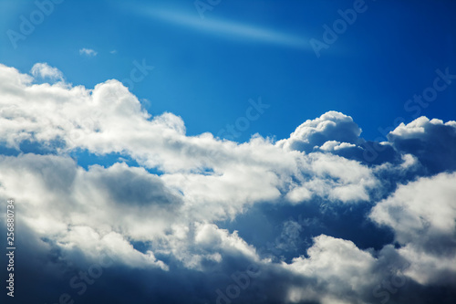 © Andrii A, Obraz premium Background of transparent white clouds in a light blue sky illuminated by the sun.