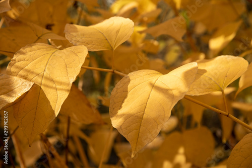 Obraz premium Background of yellow leaves illuminated by the sun.