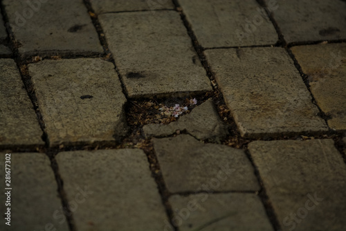 © Vlada, Obraz premium Background or texture from a broken and equal tile with patches of light and drops. Stone blocks on the sidewalk.