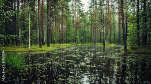 © AugmentArt, Fototapeta premium Background photo of a pine forest bay with a swamp and splashes for wallpaper