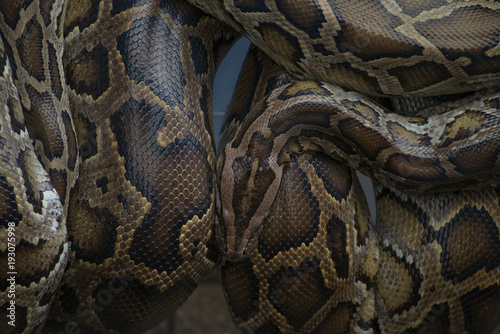 © pitipat, Obraz premium Background photo of python snake skin in dark tone.