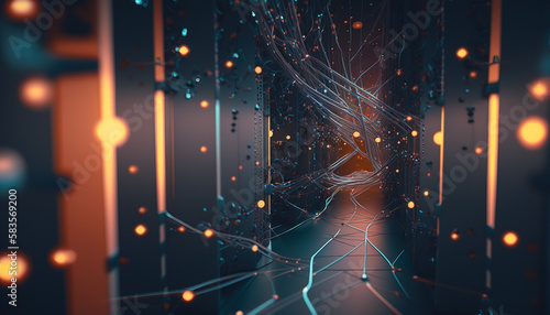 © Ruslan, Obraz premium Background - Sci-Fi Network with Wireframe Robot on Cloud Backdrop - ai generated