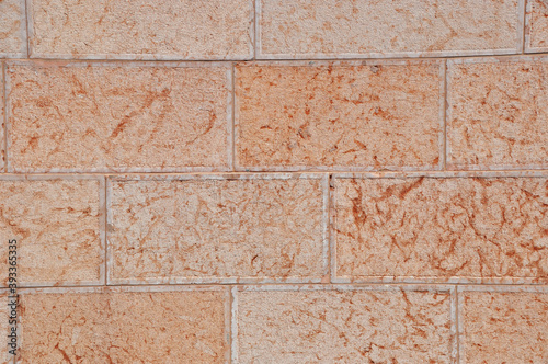 © Viacheslav, Naklejka premium Background, texture - a plastered wall with joining for large bricks. Pink color
