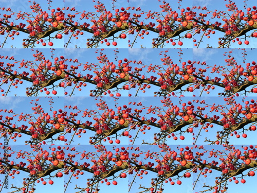 © Allgoo, Fototapeta premium Background texture image (matrix analog) of several pictures of a branch of autumn wild apples on a blue sky background. Preform for decorative framing.
