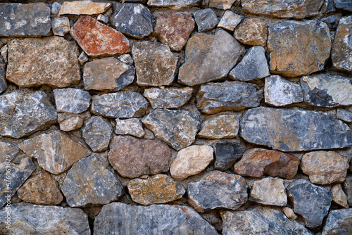 Fototapeta premium Background texture of masonry wall made of natural multicolored stones.