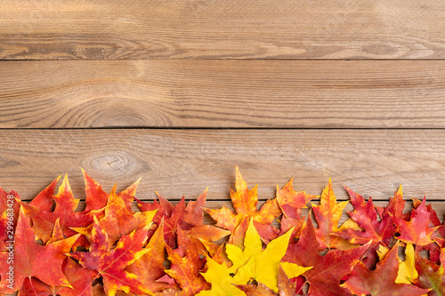© bmarya83, Obraz premium Background texture with old wooden table and yellow autumnal fallen maple leaves Top view Flat lay copy space Place for text Hello autumn, september, october, november, nature concept Rustic style