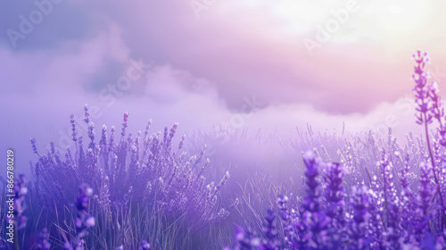 Naklejka premium Background with a fog motif in a lavender field. Lavender field close up with...