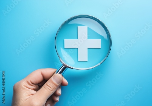 Fototapeta premium background with a magnifying glass pointed at a medical cross in blue tones