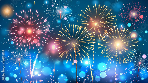 © Irina, Naklejka premium Background with bright fireworks and lights against the night sky.