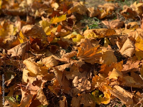 © Yuriivna, Fototapeta premium Background with fallen maple leaves.