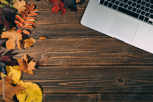 Fototapeta premium Background with laptop and autumnal leaves