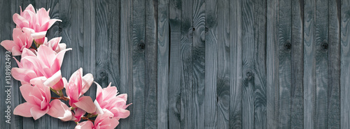 Fototapeta premium Background with magnolia flowers on wall of wooden planks