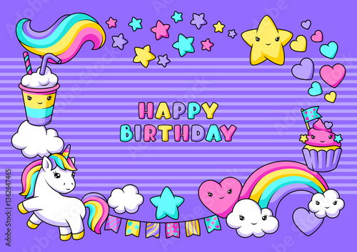 Fototapeta premium Background with unicorn. Happy birthday party invitation.
