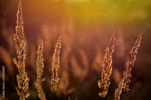 © Aleksandr Kalegin, Fototapeta premium Background yellow blades of grass glowing in the sun. Close-up