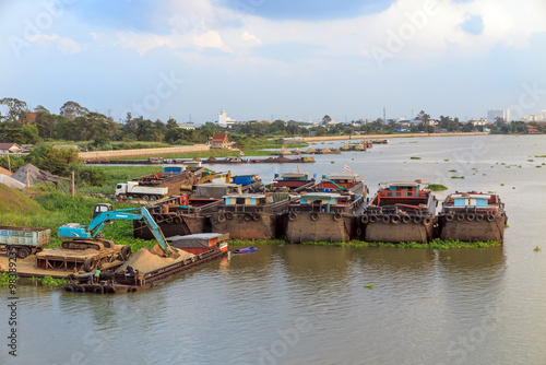 © Pawin, Fototapeta premium Backhoe load sand in Big barge