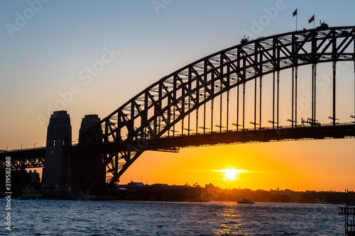 Naklejka premium Backlight photo of Harbour Bridge at sunset, Sydney