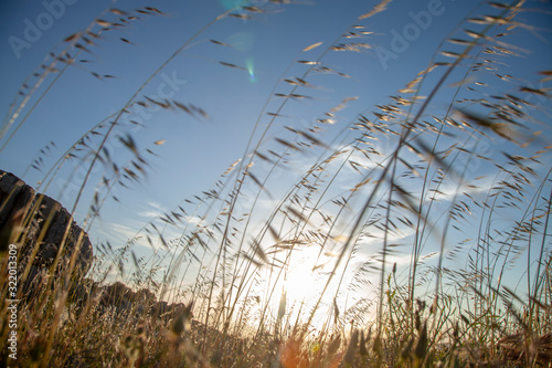 Fototapeta premium BACKLIT GRASS FIELD AT GOLDEN HOUR