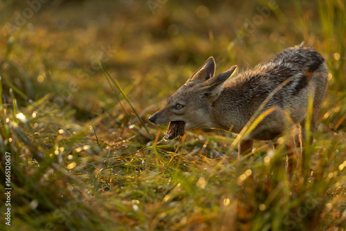 © Dr Ajay Kumar Singh, Naklejka premium Backlit image of a black backed Jackal feeding at Masai mara, Kenya