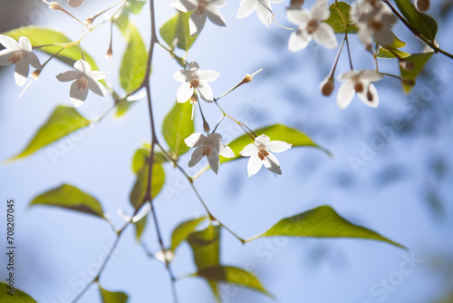 Obraz premium Backlit white cherry blossom flowers, background