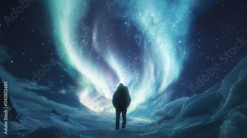 Fototapeta premium Backpacker admiring aurora borealis in snowy landscape night sky adventure serene environment awe-inspiring view