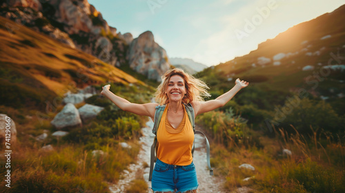 © Antonio, Naklejka premium Backpacker girl in the mountain with open arms