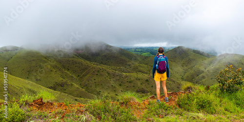 © Jakub, Obraz premium backpacker girl walks along ridge amid cerro pelado mountains during cloudy, misty weather; hiking in green mountains in Costa Rica, Costa Rica rainforests