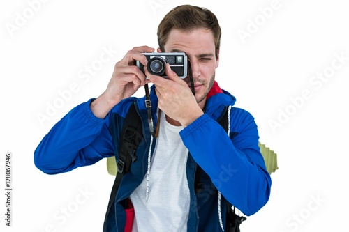 © WavebreakMediaMicro, Fototapeta premium Backpacker hipster taking pictures with a retro camera
