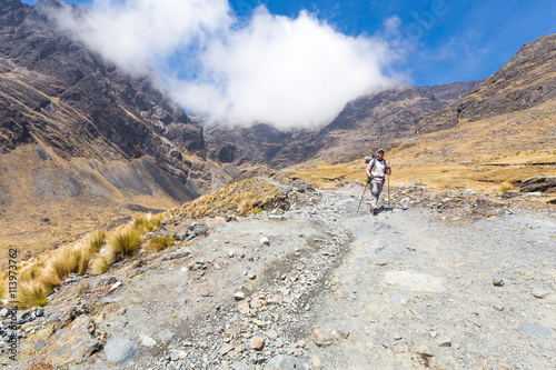 Fototapeta premium Backpacker mountaineer walking posing mountain trail, El Choro t