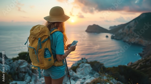© Chuemon, Obraz premium Backpacker using her phone in remote area Generative AI