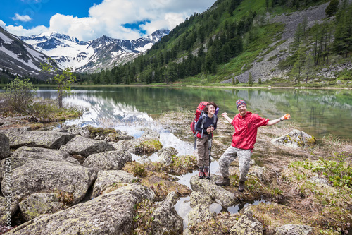 Fototapeta premium Backpackers are resting while hiking in mountains