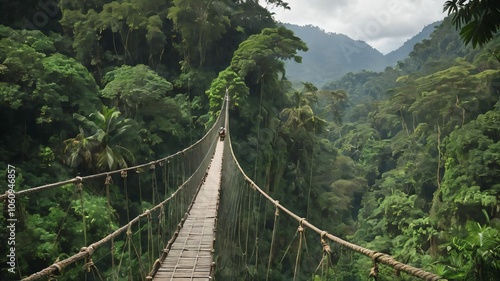 Obraz premium Backpackers crossing a suspension bridge over a lush jungle