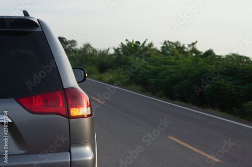 Fototapeta premium Backside of family car Gray color trip to travel in nature on asphalt road white sky for background.Open turn signal for safety.