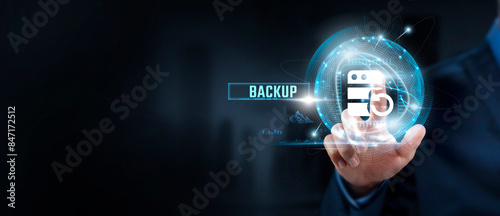 Fototapeta premium Backup Strategy: Businessman Touching Backup Icon for Data Protection and...