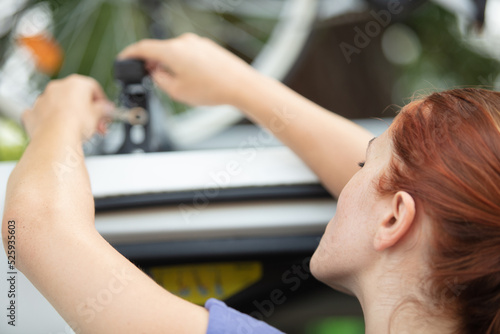 Fototapeta premium backview of woman with a bike on the roof
