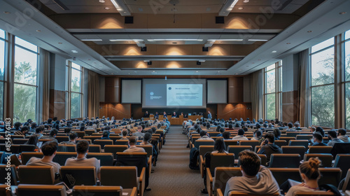 Naklejka premium Backview Perspective of Audience at Academic Conference Presentations