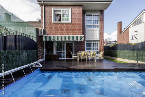 Obraz premium Backyard of a single-family home with a swimming pool covered by a protective...