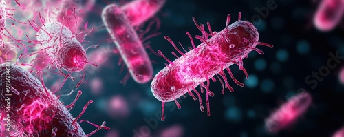Obraz premium Bacteria mutation, dark background, glowing microorganisms, microscopic...