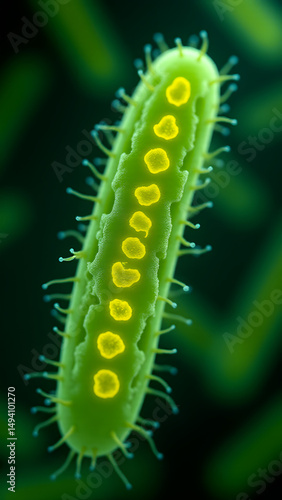 Fototapeta premium Bacteria with glowing grooved surface, nanoscale ridge details, microscopic...