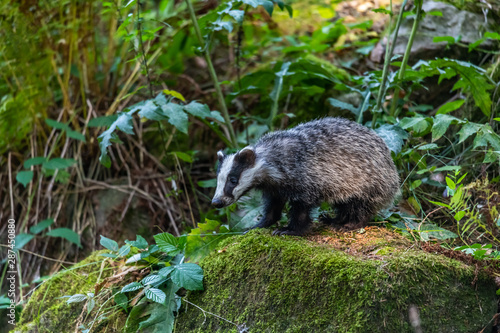 © vaclav, Naklejka premium Badger in forest creek. European badgerforest swimming in the water, animal in the nature forest habitat, Germany, central Europe. Wildlife scene from nature. Mammal in the water. (Meles meles)