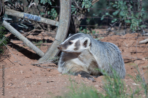 © Melani, Naklejka premium Badger resting for a while after digging around an old rustic wagon wheel. One front foot is forward showing the long powerful claws she uses to dig.
