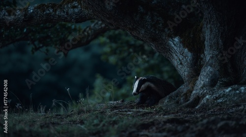 © Fandi Comp, Fototapeta premium Badger underneath tree nighttime