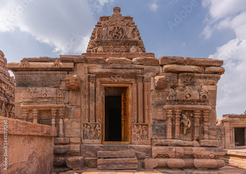 © Klodien, Fototapeta premium Bagalakote, Karnataka, India - November 7, 2013: Pattadakal temple complex. Front side with sculpted doorway of brown stone Jambulingeshwara temple under blue cloudscape.