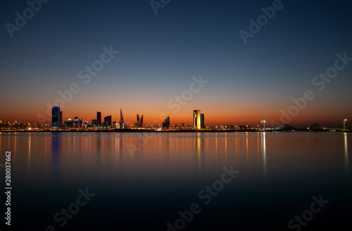 Naklejka premium Bahrain skyline during evening hours at sunset