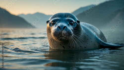 © Irina, Fototapeta premium Baikal seal swimming in the calm waters with mountains in the background during golden hour