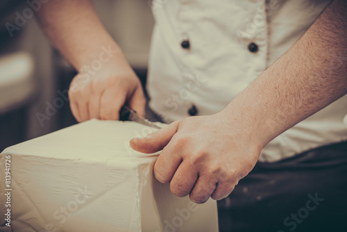 © Daniela Baumann, Obraz premium Baker cuts butter from a big block