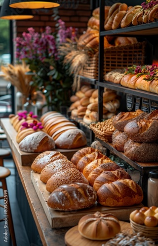 Fototapeta premium Bakery showcasing an array of fresh breads with prominent signage