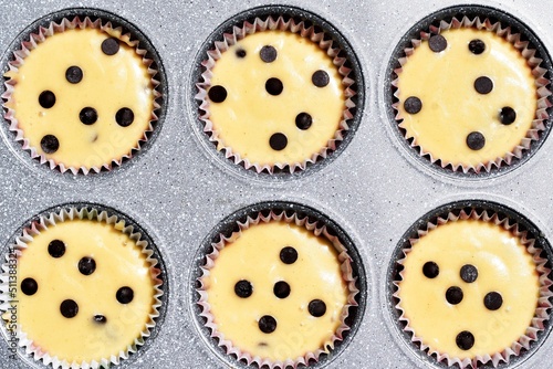 Fototapeta premium Baking tray with muffins paper cases filled with muffin dough, ready for baking. Making of muffins with chocolate chips
