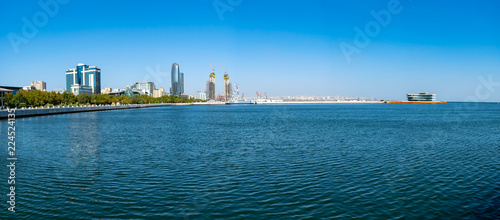 © studiographicmh, Naklejka premium Baku, Azerbaijan - September 26, 2018. Panoramic view of skyline in Baku, Azerbaijan, with historic and modern architecture. Blue Caspian Sea Panorama