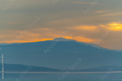 Fototapeta premium Balıkesir Lake Manyas at sunset boats reflection vegetation cloudy sky