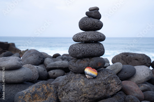© neirfy, Fototapeta premium Balance stone tower on wild sea shore